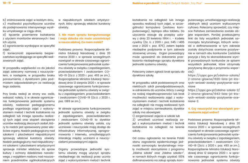na uwadze troskę i dbając o dobro naszych rodzin, przygotowaliśmy poradnik dotyczący prawnych uwarunkowań związanych z pandemią. Zebrane w nim zagadnienia są odpowiedzią na zgłaszane przez Was problemy w ankiecie przeprowadzonej przez Związek Dużych Rodzin 3 Plus w październiku 2020 roku i dotyczącej sytuacji pandemicznej w Polsce.